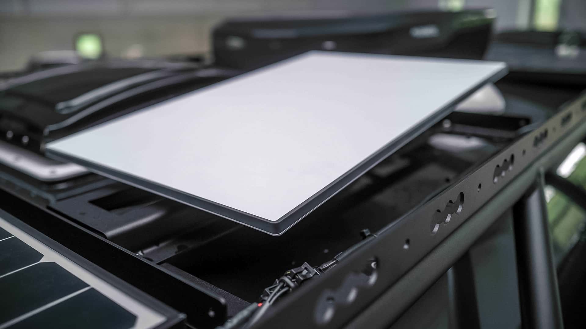 Herzstück des Off-Grid ist das neue Dachträgersystem: eine stabile, aber leichte Rohrrahmen-Konstruktion, die die nutzbare Fläche auf dem Dach erweitert und zugleich die Dachlast reduziert. So finden auf dem Hochdach Solarmodule mit bis zu 1.030 Watt Leistung Platz – genug, um das autarke Energiepaket mit 4,1-kWh-Lithiumbatterie und Induktionskochfeld zu versorgen. Gasanschluss? Fehlanzeige.