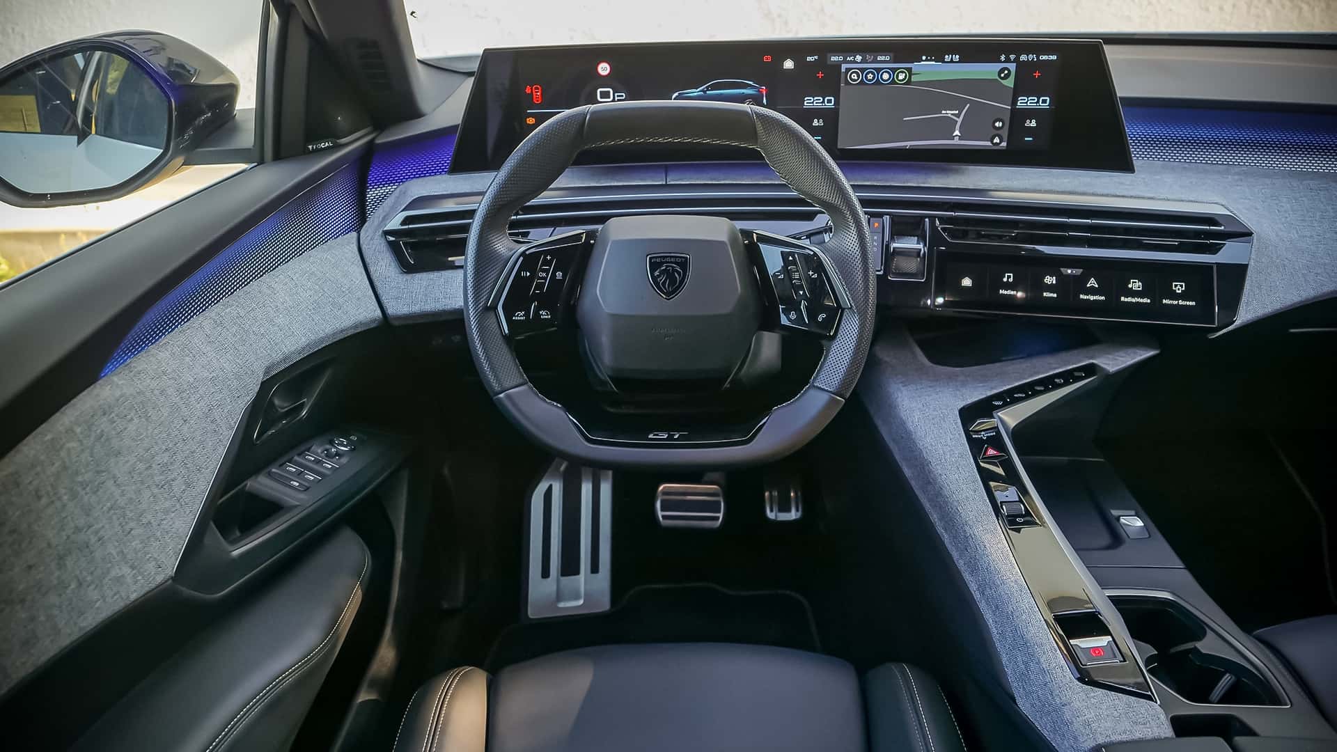 Optisch setzt der Peugeot E-3008 auf ein kantiges Fastback-Heck und schwarze Kontrastdetails. Im getesteten GT-Modell fallen das geschwungene 21-Zoll-Panoramadisplay, Ambientebeleuchtung und saubere Verarbeitung ins Auge. Das kleine, abgeflachte Lenkrad ist gewöhnungsbedürftig, funktioniert aber nach kurzer Eingewöhnung.