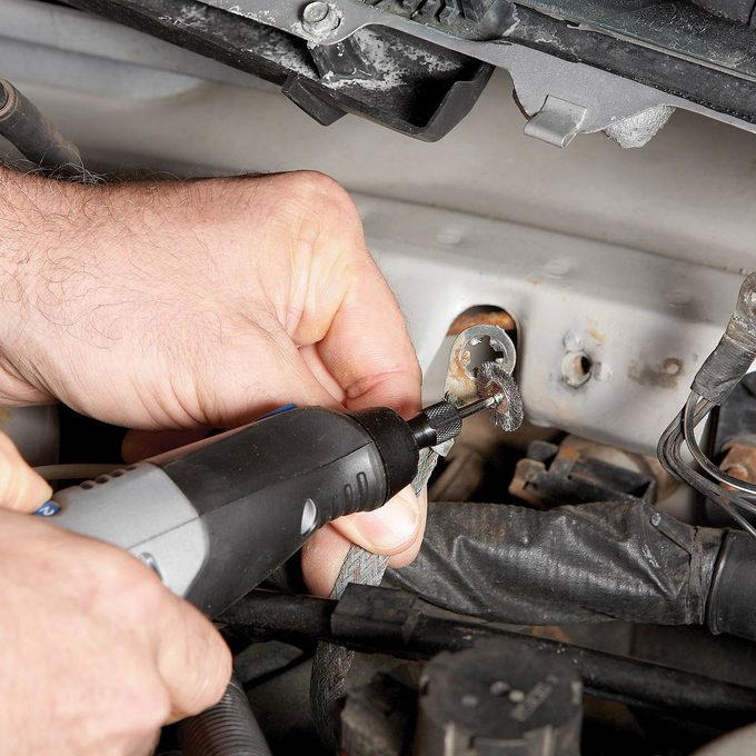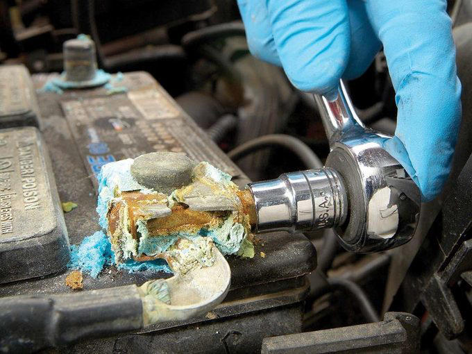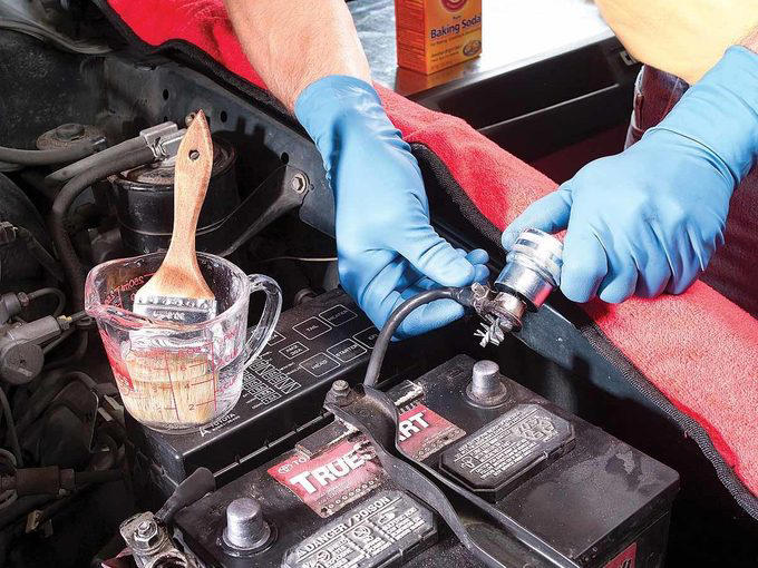 Clean corrosion from the top of the auto battery first and then clean corrosion from around the battery cables with a post cleaner.