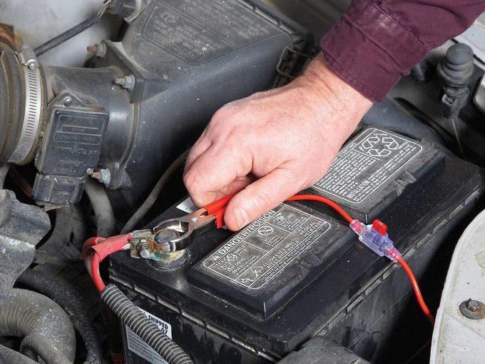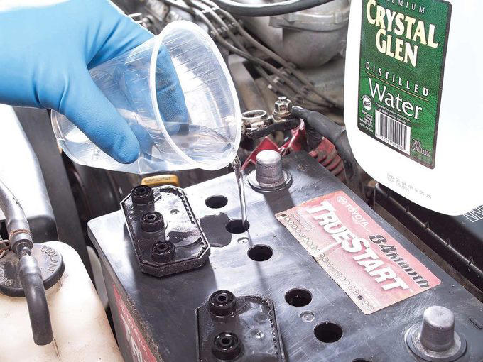 Gently pry off the covers of the battery cells. The water and acid mixture in the battery (electrolyte) should be about 1/2 in. deep or to the bottom of the fill hole. If it needs water, use clean distilled water, being careful not to overfill the cells, and then inspect the battery case for cracks. If you find a crack, replace the battery. If you added water, let the water mix with the electrolyte for a few hours before the next step. (You may need to reconnect the battery to maintain your memory functions.) Check out more battery care tips here.