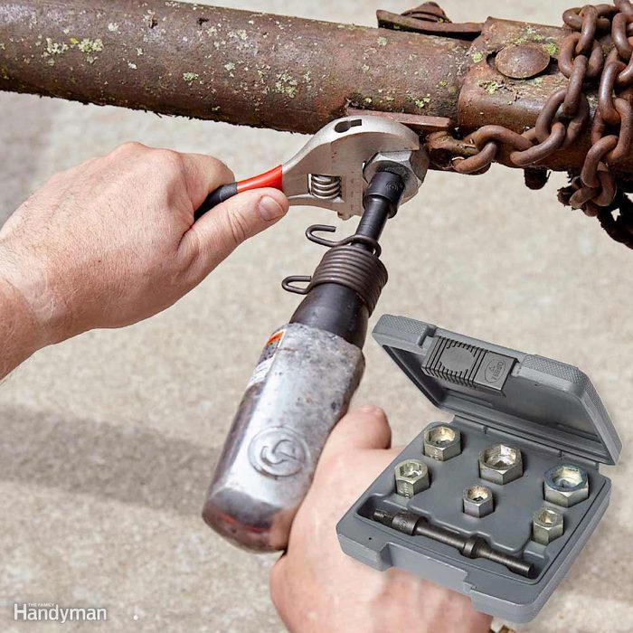 This tool and a can of rust penetrant are the secret to removing stubborn rusty seized bolts. Load the driver tool into your air hammer and slide on a socket and wrench. When you hit the trigger, the driver applies the impacts to the center of the bolt head, demolishing the rusty buildup. Turn the wrench and socket during the impacts and you'll loosen the bolt or nut in no time.