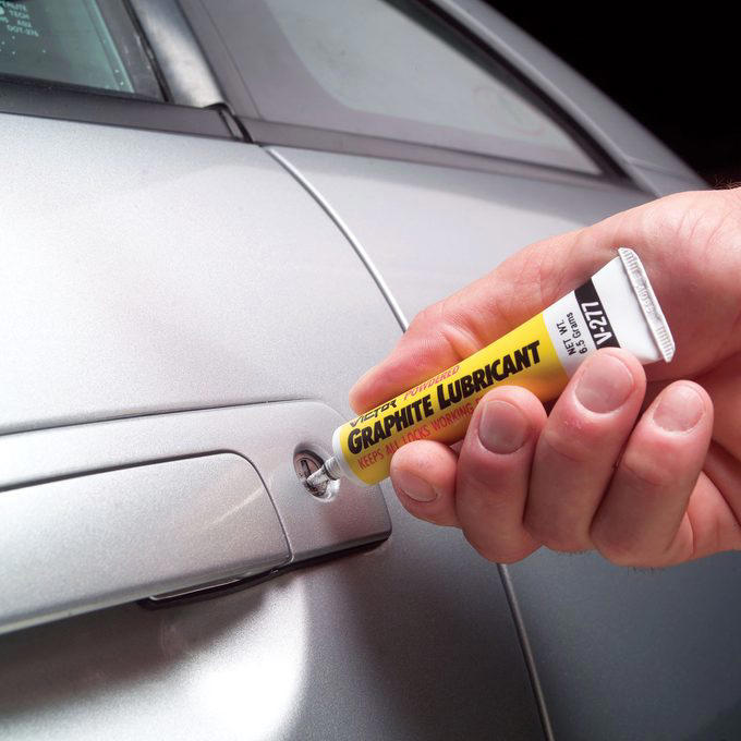 Graphite powder keeps delicate lock mechanism working. We don’t think much about our door locks until the key breaks off in the cylinder. Keep these delicate mechanisms moving freely with a blast of dry graphite powder. You may need to push the dust protector flap back slightly with a small metal nail file to get at the lock. A quick pump of the tube will dispense enough graphite. Move the lock cylinder with your key several times to work the graphite into the mechanism. Do this to your trunk lock as well. Check out other amazing ways to loosen up locks on cars.
