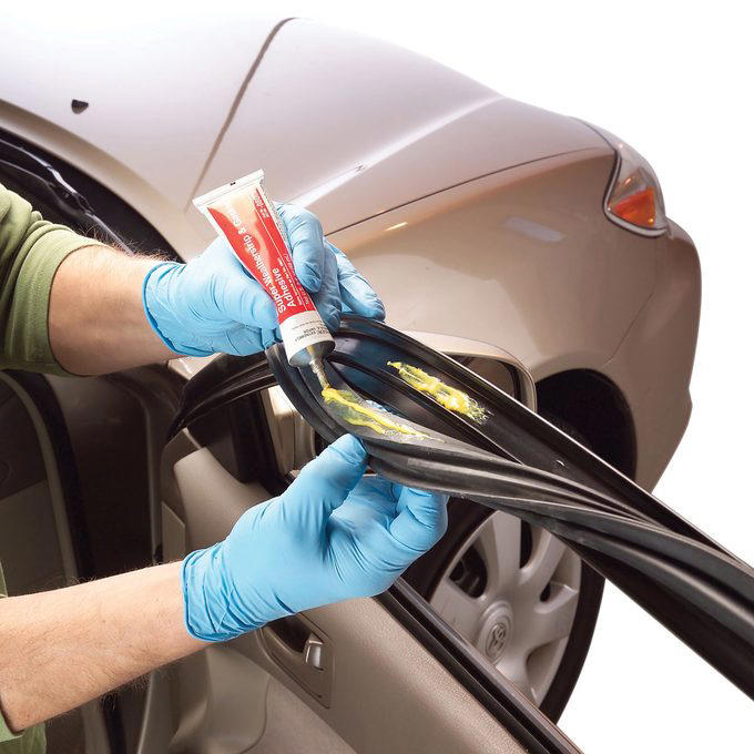 Repair torn weather stripping on car doors quickly and easily, and treat it with silicone spray to prevent winter freeze-up and further weather stripping damage.