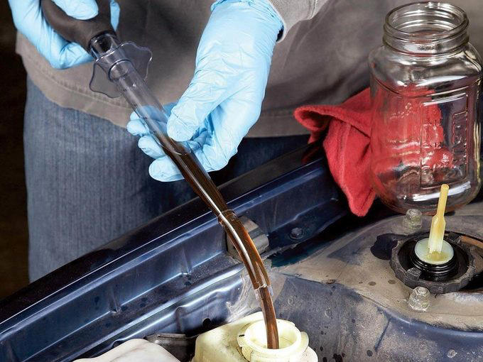 Use a baster to suck out the dark brown brake fluid (brake and power steering fluids are incompatible, so use a different baster for each). Squirt it into a recycling bottle. Refill the reservoir with fresh brake fluid as shown. Then drive the vehicle for a week to mix the new fluid with the old. Repeat the procedure several times over the next few weeks until the fluid in the reservoir retains its light honey color.
