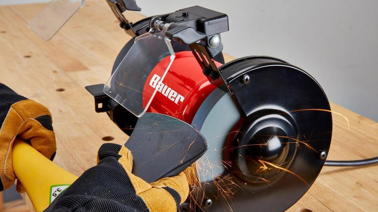 Its 2.1-amp motor is just as powerful as the Ryobi grinder, and both tools feature built-in LED lights for better precision. The Bauer grinder spins up to 3,450 rpm and features two 6-inch grinding wheels made from aluminum oxide. It's sold without a stand and without the AAA batteries needed to power its LED lights. A 6-foot power cord is responsible for delivering power to the tool itself.