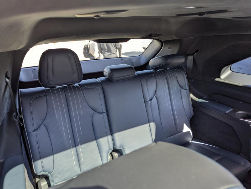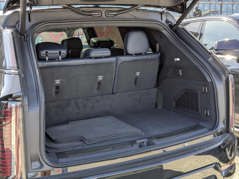 Cargo space? Up to 119.1 cu. ft. behind the first row, 69.1 cu. ft. behind the second row, or 23.6 cu. ft. behind the third row. It even has a frunk, which Cadillac calls the “eTrunk” that can accommodate up to 12.2 cu. ft. of cargo. As for how comfy the seven passengers will be, front legroom sits at 45.2 inches, second row legroom at 41.3 inches, and third row legroom at 32.3 inches. It can get a bit cramped for taller folks in the very back, but it’s not the worst either.