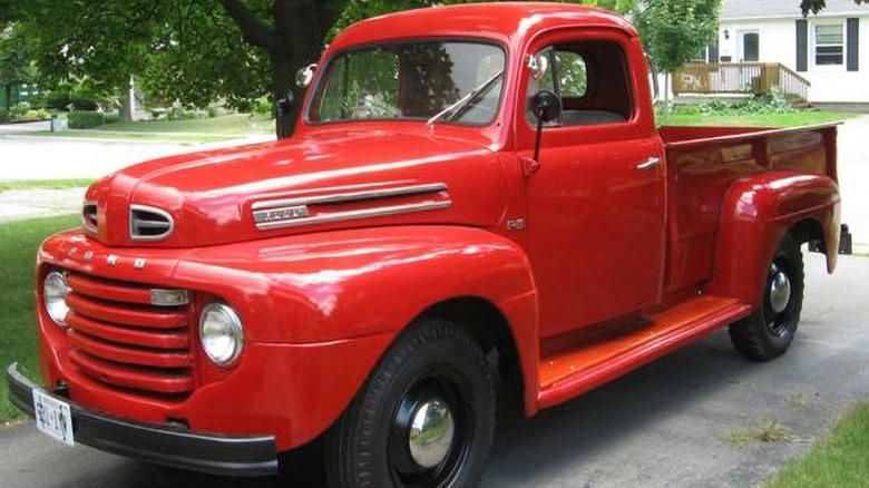 A red 1950 Ford F3 pickup parked in a suburban driveway.