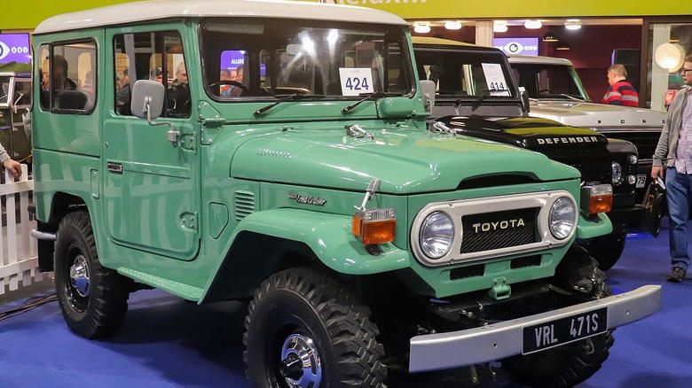 Teal Toyota FJ40 Land Cruiser on blue carpet at car show, Land Rover Defender and Ford Bronco in background