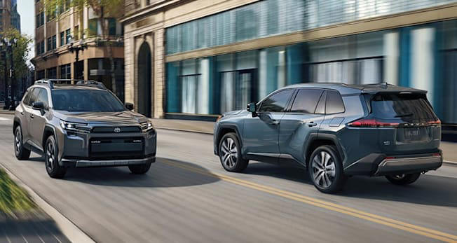 The 2026 RAV4 Woodland (left) and Limited are a styling contrast. One has a tougher, rural look while the other has a more upscale, urban appearance.