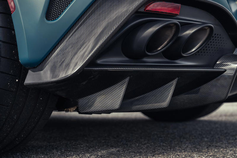 The Vantage roadster shares its driveline with the coupe, starting with an AMG-sourced twin-turbo 4.0-liter V-8 tuned for Aston-specific performance. The droptop makes 656 horsepower and 590 pound-feet of torque (just like the coupe) and tops out at a claimed 202 mph (also like the coupe). A rear-mounted eight-speed automatic transaxle is the only gearbox Aston offers here, having dropped the dog-leg manual for the 2022 model year. The rear axle's power balance comes by way of an electronically controlled limited-slip differential. The roadster's mass sits neatly in a quoted 49:51 front-to-rear split, as opposed to the 50:50 distribution of the coupe, and 60 mph is claimed to arrive in just 3.5 seconds—a mere tenth of a second behind the hard top, the last of which we tested bettered its estimate with a 3.2-second dash.