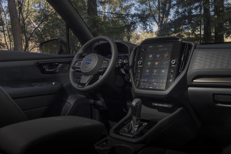 The 2025 Subaru Forester Hybrid has an instrument panel that features a 12.3- inch digital instrument cluster and an 11.6- inch vertically-oriented infotainment touchscreen.