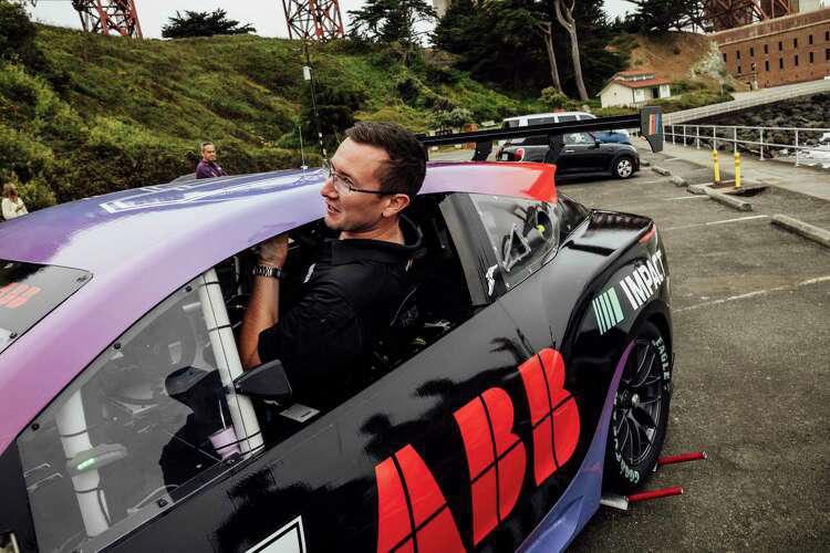 Tim Murphy, senior director, design engineer at NASCAR, climbs into the cockpit of an ABB-NASCAR prototype electric race car on Friday at Fort Point in San Francisco ahead of NASCAR weekend at Sonoma Raceway. (Stephen Lam/S.F. Chronicle)