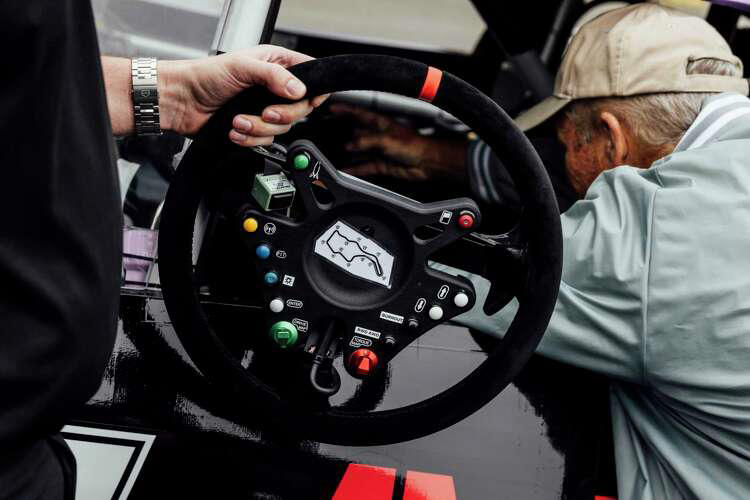 A map of Sonoma Raceway is seen on the steering wheel of an ABB-NASCAR EV Prototype at Fort Point near the Golden Gate Bridge ahead of NASCAR weekend at Sonoma Raceway. (Stephen Lam/S.F. Chronicle)