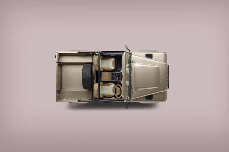 Inside, Land Rover boasts five monotone and eight two-tone interior leather options. Plus, you can spec all sorts of funky onboard accessories, like a wine cooler or surfboard rack. Both the side and rear sections of the top can be rolled up for open-air driving, and Land Rover points out that it has added extra tie-down points for this build, to better secure the canvas at highway speeds.