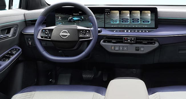 The 2026 Nissan Leaf SV+ and Platinum+ trims get dual 14.5-inch screens, while the lower trims make do with two 12.5-inch screens.