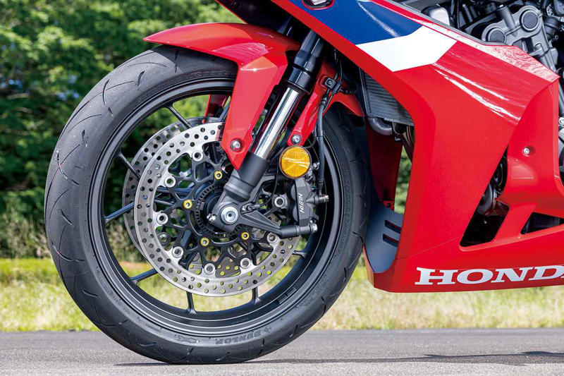 足まわりにはインナーパイプ径Φ41mmのショーワ製倒立フォークを採用。減衰機構は右側のみに配置される。