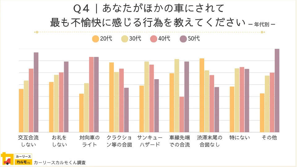 なお、不愉快に感じる行為を年代別に見ると、50代では「1台ずつの交互合流をしない」や「お礼の行為がない」の割合がほかの年代に比べ特に高く、マナーの基準が明確で、重んじる意識がより強いことがわかる。