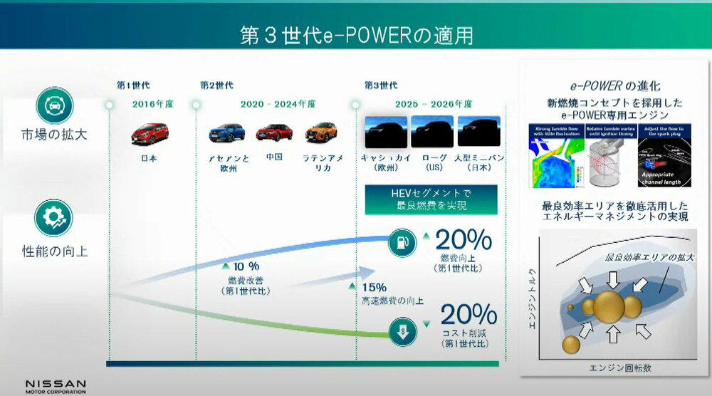 そんなe-POWERですが、日産は2025年2月13日の決算発表において、第3世代e-POWERを2025年度から2026年度にかけて、市場投入することを発表。日産によると、第3世代e-POWERは初代e-POWER比で燃費を20%向上させ、コストも20%削減。さらに、高速走行時の燃費については、第2世代e-POWER比で15%の改善を達成するとしています。