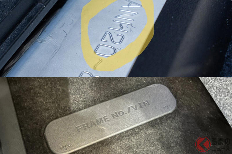 上:20系に張り替えられた30系の車台番号/下:40系の車台番号刻印場所は30系は違うことがわかる(画像提供:筆者)アルファードは2023年には700台が盗まれて警察庁発表の車名別盗難認知件数の1位となりました。