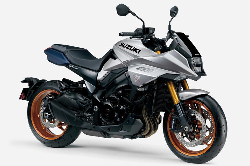 2025年モデルはボディにカタナらしいシルバーカラーを採用しつつも、テールカウルにマットブルー、ホイールに渋めのオレンジを配色した「ミスティックシルバーメタリック」と、昨年のKATANAミーティングでサプライズ披露された“青カタナ”「パールビガーブルー」の2色のニューカラーが登場。
