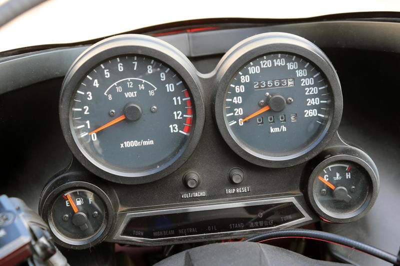 インパネは左右非対称で左に大きなタコメーター、右にやや小ぶりなスピードメーターを配置する。その左右には燃料計と水温計を設置。