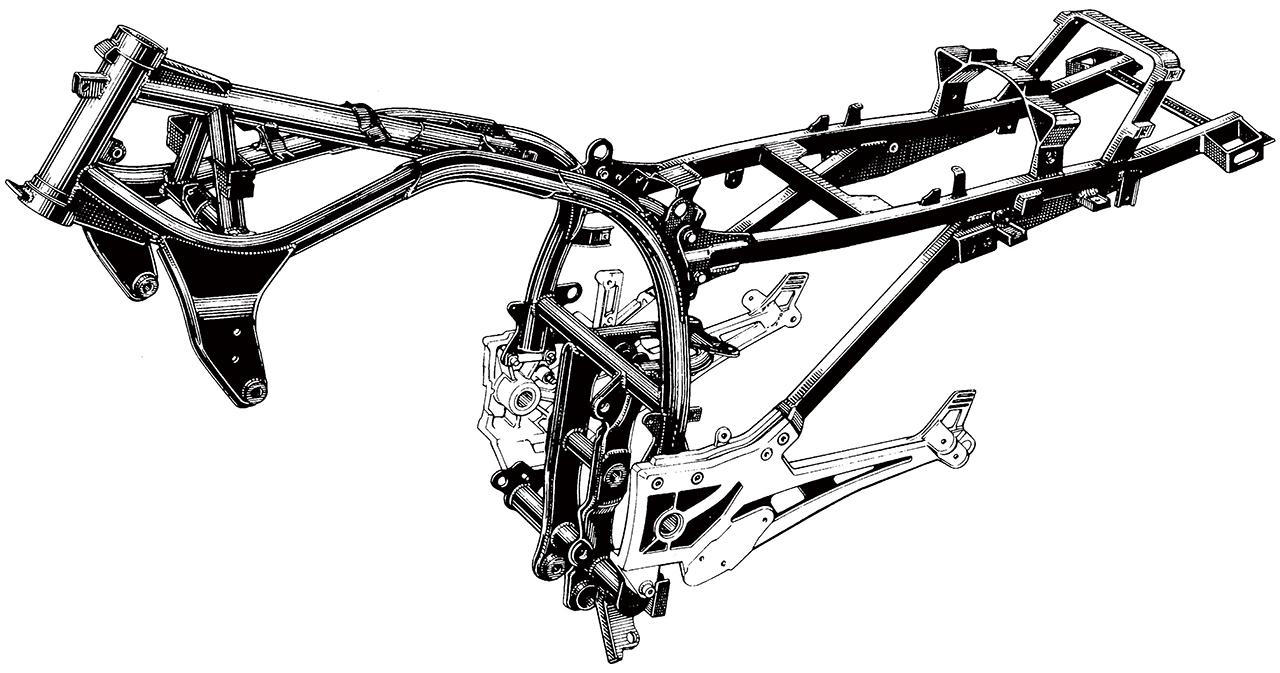 高張力鋼管とアルミのシートレールを組み合わせた構造で、エンジンそのものを強度メンバーの一部とするダイヤモンドフレームを採用。