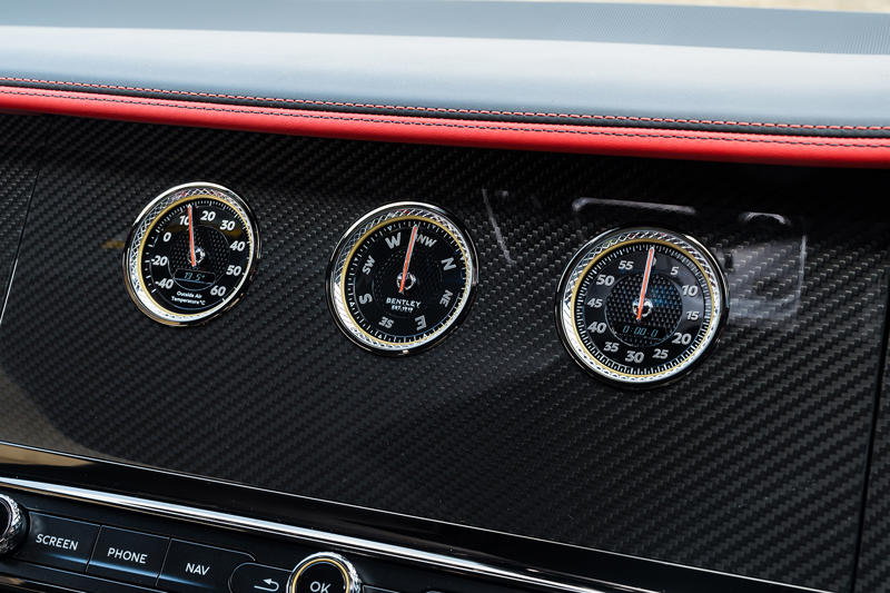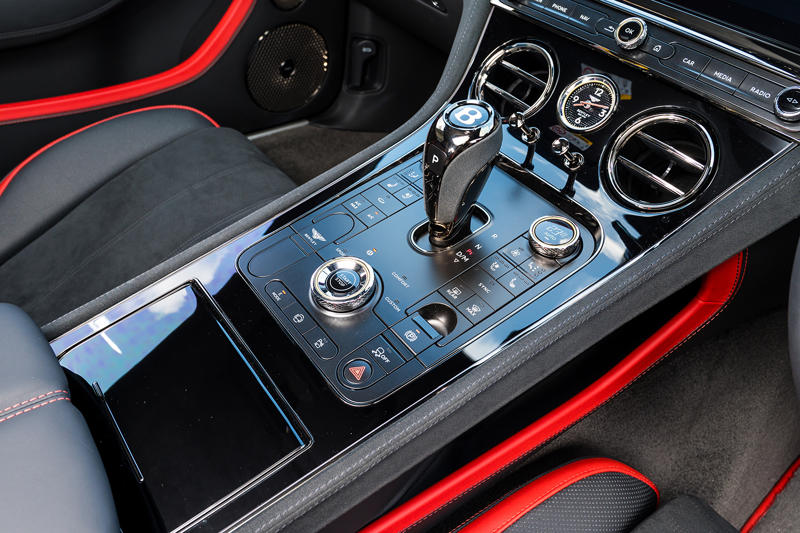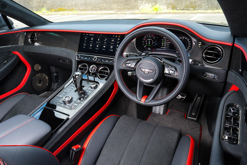 スペックシートには「ピラーボックスレッド」と「ベルーガ」のコンビ内装としか記載がない。いちいちカッコいいネーミングだがそれは色のことだけだろう。ピラーボックスとは円柱型の赤い郵便ポストのこと、となればベルーガは最高級キャビアからとった濃いグレーということになる。ハイグロスカーボンパネルはちょっと好みではないが、ラグジュアリーやゴージャスを超えて「ウェルネス」と掲げるベントレーならではの、実にくつろげる空間である。富裕層の第一の関心事は美と健康なのである。