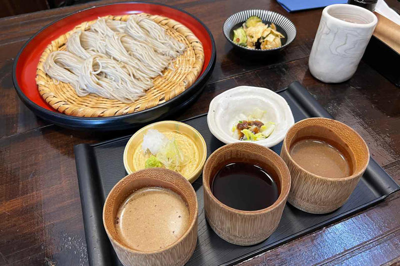 豊かな風味と細めの麺が特徴で、根曲り竹のザルに盛る「ボッチ盛り」の様式で提供され、甘みのあるごまくるみダレに絡めていただきます。