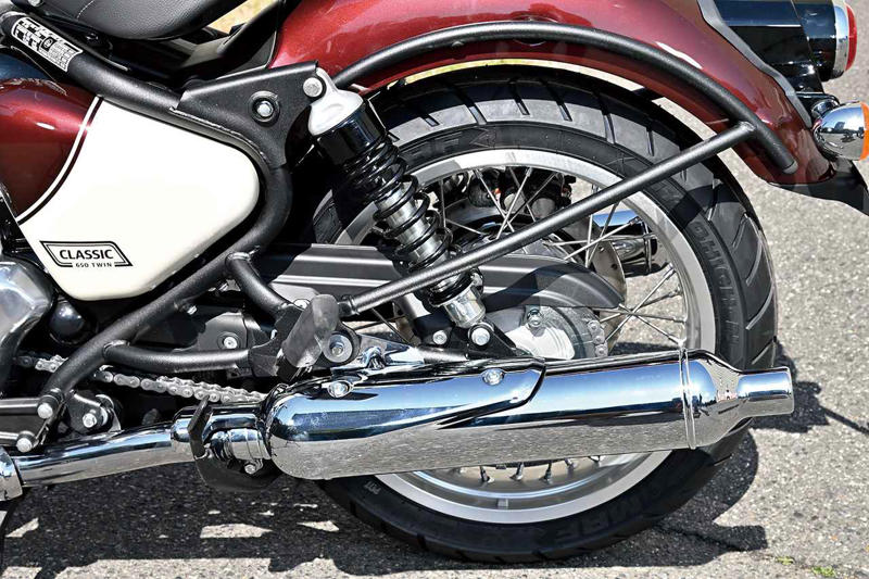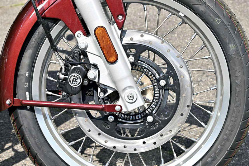 フロントは19インチを採用し、クラシカルな雰囲気を強調。ホイールは前後スポーク、タイヤはインドのMRF製を標準装着する。