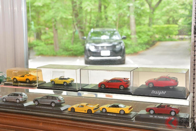 ミニカーやポスターなどのクルマに溢れた店内からも愛車を眺めることができる(場所:「GAFE GT」)自分自身を振り返ってみると、かつて旅の移動はできるだけスピーディに務めていたように思う。