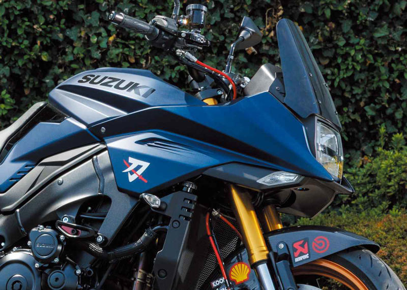 KATANAにGPマシンのような雰囲気を付加させるアクラポビッチ製マフラー。前後カバーはカーボンでサイレンサーはチタンを採用した高級品。
