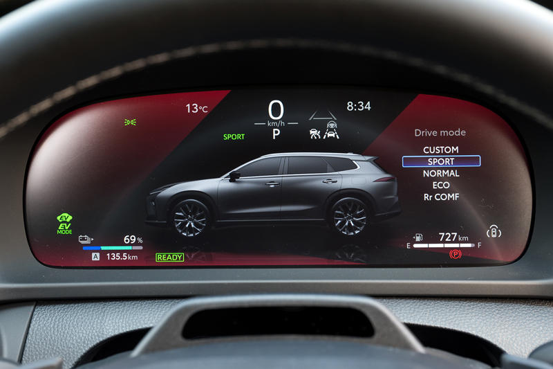 試乗車はPHEVのRS。その走りも、やはり余裕という言葉を実感させる仕上がりである。トヨタのPHEVは大容量バッテリーをEV走行距離の長さにだけでなく通常走行にも活用して、電気モーターの受け持つ領域がハイブリッド車よりも明らかに大きい。発進は力強いだけでなく滑らかで、その後の加速も爽快。エンジンが始動するころには速度が高まっているので騒音なども気にならず、心地よいクルージングを楽しめる。