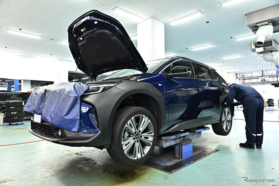 ちょうど12か月点検で入庫したので、特別に許可を得て撮影と見学をさせてもらったが、ボンネット内点検ではウインドウォッシャー液の確認をし、少なくなっていれば補充。その他に駆動用バッテリーの専用フルードの容量確認や、クーラントの容量確認、12Vバッテリーの充電量の確認など点検項目は多く無い。