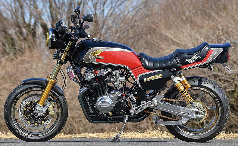 気になるギラギラの外装はオーナーがペインターにオーダーを済ませていて、この車体が出来上がる際に合わせて装着されたとのことだが、車両に無理なく溶け込んでいる。リヤワイドタイヤやそれに合わせた新・17インチ仕様を作り、細かなフィニッシュもと進められたパッケージング。CB-Fという車両とその細部、パーツをよく知るショップだからこそのまとまりはこんなところに現れるのだ。