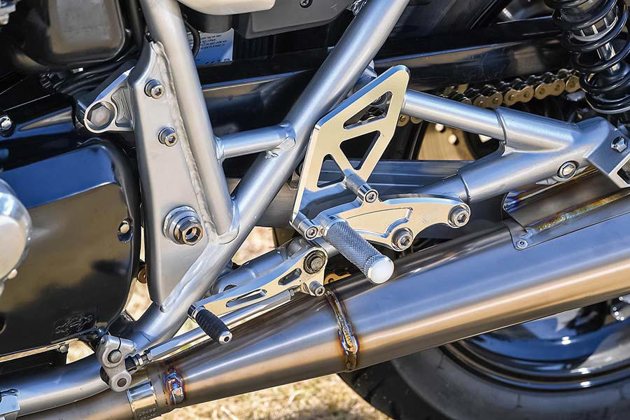 スイングアームピボットシャフトや前後アクスルシャフトはクロモリに変更されて車体のしっかり感に寄与する。