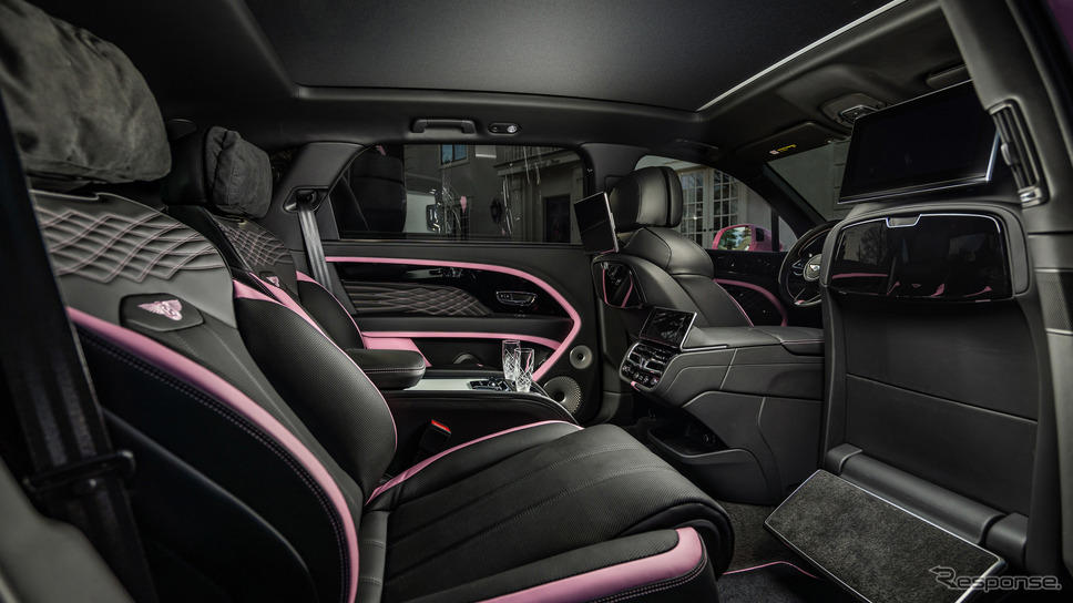 ピンクの外装には、チェリーブロッサムレザーとマッチングスレッドでアクセントを付けたインテリアが組み合わされ、シートに刺繍されたベントレーウィングにまで及んでいる。顧客は後席に座る際のために、すりガラスのソフトクローズドア付きマリナーボトルクーラーを後席エアラインシートと並んで設置するよう指定した。
