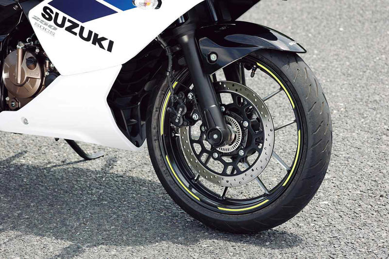 250ccエンジンの搭載、フレームの剛性アップ、フルカウル装備などでSFの車重はジクサー150よりも19kg重いが、それでもGSX250Rと比べると20kg軽く、ハンドル切れ角も大きいから取り回しはまったく苦にならない。カウルの端から見える油冷エンジンも、シンプルなシリンダーヘッド構造と冷却フィンを持たないシリンダーによって、実にコンパクトにまとまっている。