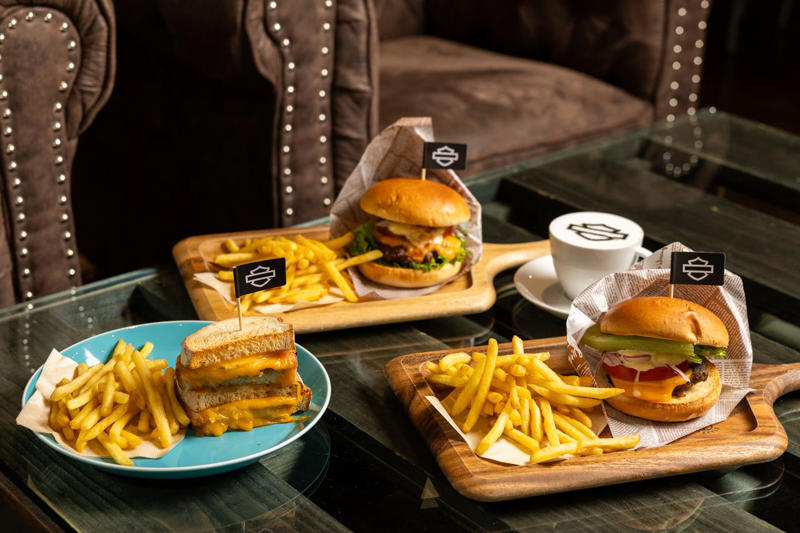 カフェですから、もちろん飲食メニューも充実! 「ハーレーアボカドバーガー(1800円、写真右)」、「ハーレーチーズバーガー(1400円、写真奥)」、「ハーレーホットサンド(1400円、写真左)」のほか、アイコニックなシールドマークのラテアートが施された「ハーレーラテ(800円)」を楽しめます。役得で我々スタッフも試食させてもらいましたが、どれも絶品でした!