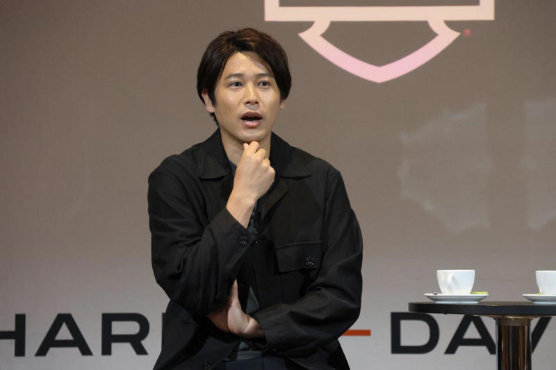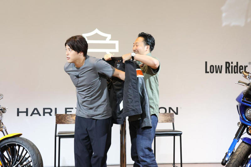 発表会のサプライズゲストとして登場したのはサッカー元日本代表の内田篤人さん(左)。右はハーレーダビッドソン ジャパン代表取締役の玉木一史氏。