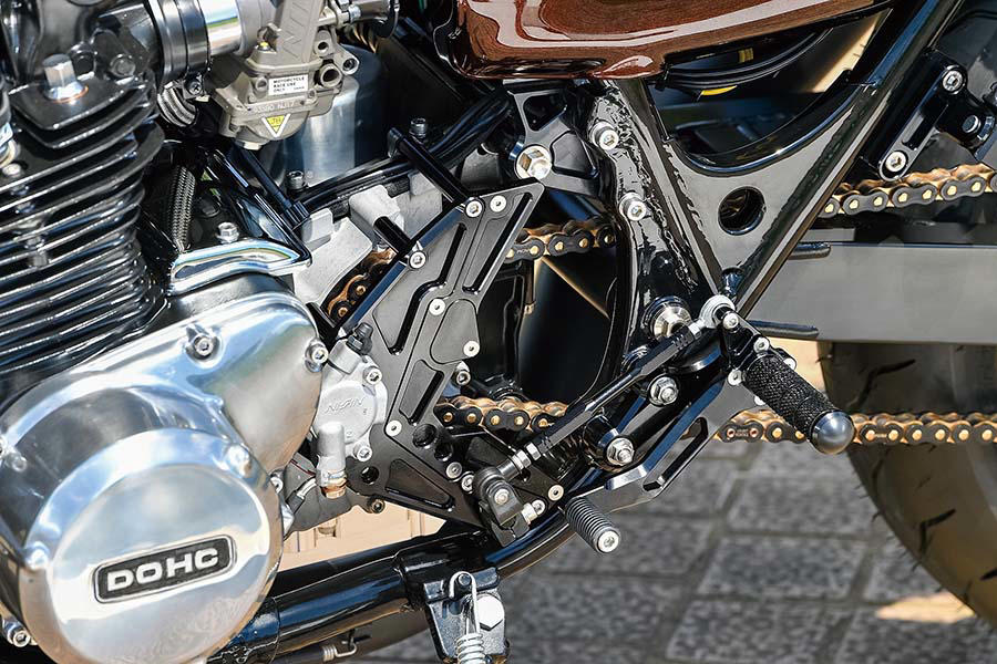 リヤブレーキはブレンボP2-CR84 2Pリアキャリパー+サンスター・トラッドディスクΦ250。排気系にはナイトロレーシング4in1機械曲げスチールメガホンをチョイス。