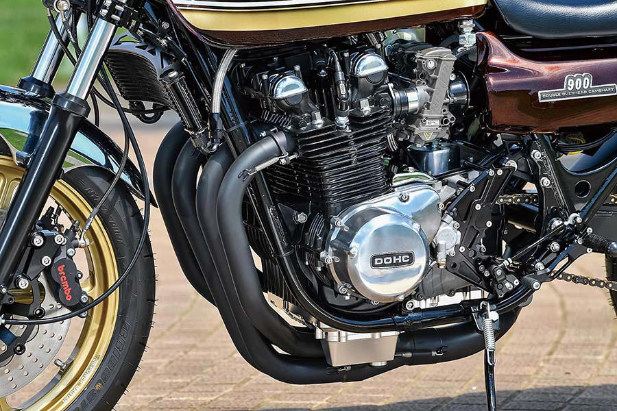 ACサンクチュアリー・中村さんがこう説明するタイガーパターンのZ1。RCMの通算製作番号であるシリアルナンバーは641が付く。フレームはレーザー測定からストレッチや補強、リヤワイドレイダウン等を行い、エンジンは外観ガンコートや内燃機加工部門DiNx(ディンクス)による各部精密加工がされた上でサンクチュアリーで緻密に組まれ、ストレートな作りの18インチコンプリートとしての定番的に完成した。