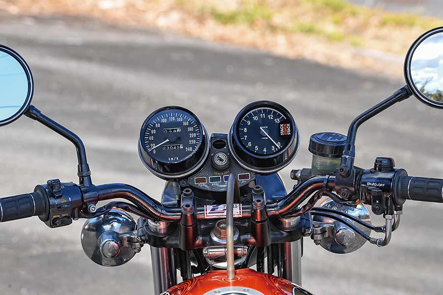 ステムなどはノーマルでハンドルバーはZパーツ。メーターは純正ベースにエンジン回転計のケースにSTACKクラブマンST200を埋め込んでいる。