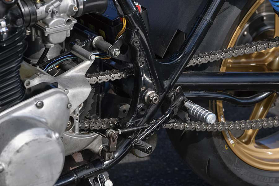 丸穴肉抜きレバー&可倒式バーのステップは「モリワキモンスター風のオリジナル」と長谷川さん。ドライブチェーンはD.I.DのZVMX530を使う。