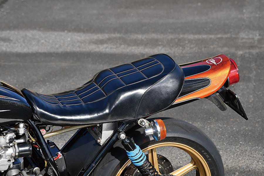 シートは加工してサイドカバーレス、シート下パーツも移設した仕様だ。
