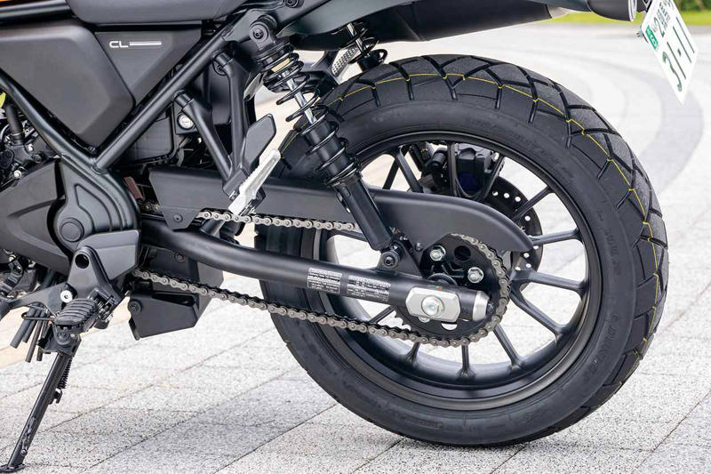 リアサスペンションはオーソドックスな2本ショックで、プリロード調整が可能となっている。リアタイヤは17インチの150サイズ。