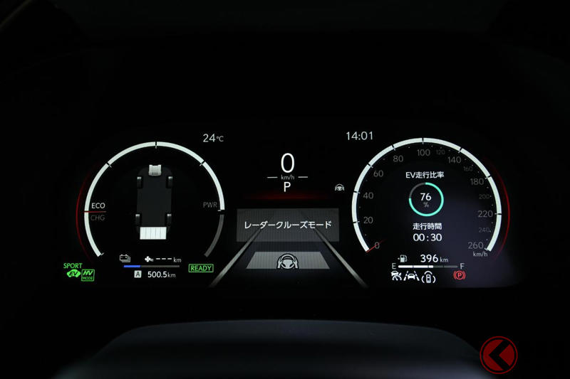 定常走行時はエンジンがより遠くで回っている感じでエンジンは完全に黒子に徹しています。また、従来モデルはアクセル開度を高め(HEVメーターで3/4くらい)だと音量が途端に増し濁音多めの音質も含めてガッカリでしたが、新型はよほどの急加速をしない限りは気にならないレベルです。