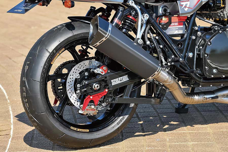 リヤブレーキはブレンボCNC 2Pキャリパー+サンスター・ワークスエキスパンドΦ250ディスクでブレーキラインはアレーグリ。リヤサスはブロックピーススタビライザーを追加したスカルプチャー・ワイドスイングアームにオーリンズ・ブラックライン(SU143)の組み合わせで、ロアマウント部にエキセントリック安謝アスターを使う。前後ホイールはO・Zアルミ鍛造のGASS RS-Aで3.50-17/5.50-17を履く。