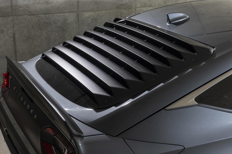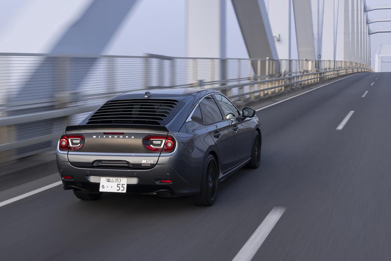 フロントセクションでは、フェイス部分も含めたバンパー全体とボンネットフードが専用なのは一目瞭然である。しかし、よくよく観察すると、シビックそのままのドアのプレスラインを引き継ぐフロントフェンダーも専用パネルのようだ。リアはバンパーに加えて、バックドアにリアエンド部品を追加している。バンパーに組み込まれている先進運転支援システムのセンサー類も移植されており、先進安全性能も基本的にベース車から後退させないのはミツオカの美点だ。