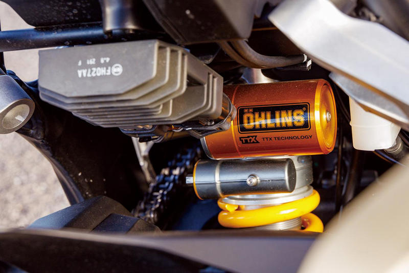 SPのリアショックは、オーリンズTTX36が奢られている。伸びと圧、それぞれのオイル通路が独立している。高い作動性と、細かな減衰力調整ができるのが特徴だ。
