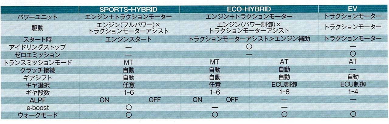 上の表はスポーツ、エコ、EVの各モードにおける駆動方式、変速モード、シフト方式、仕様ギア段数、ALPFの設定をまとめたもの。使用モードの設定で、合わせて6パターンもの変速設定が用意されており、先進性を感じさせる内容となっている。